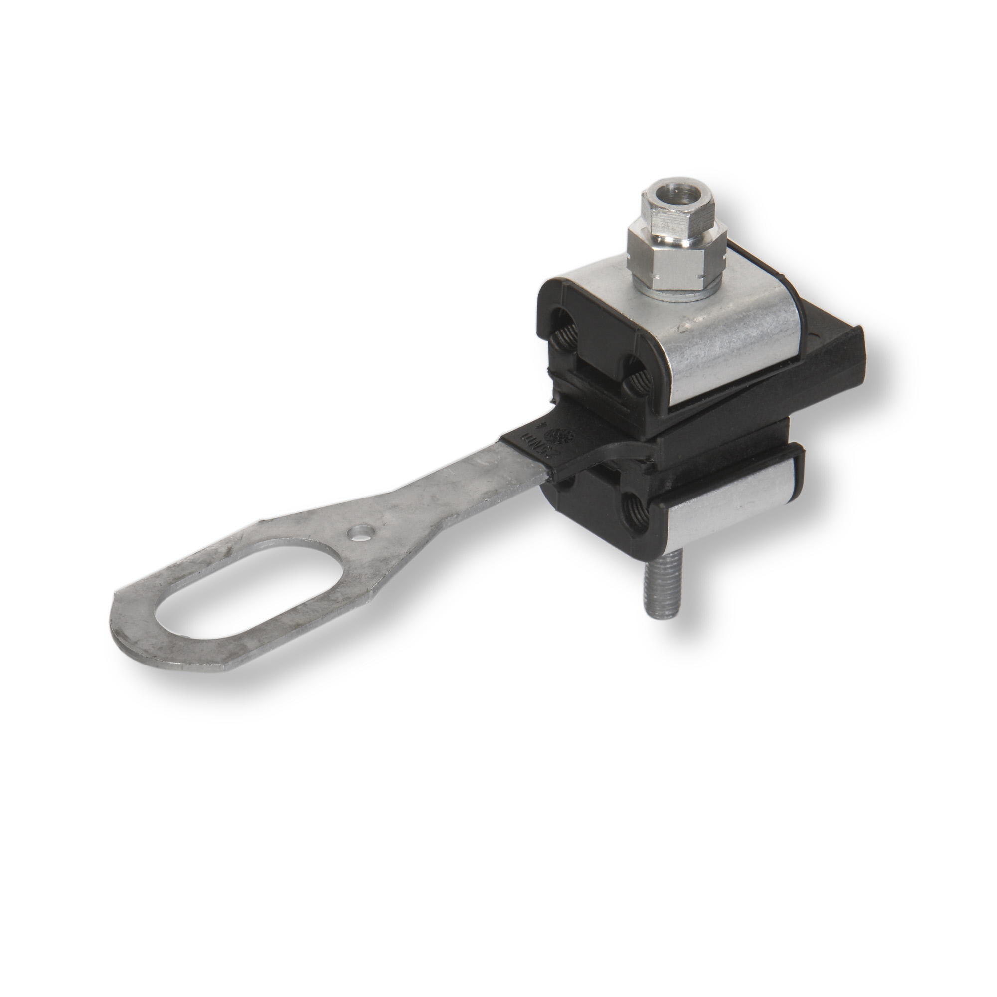 Tension clamp for the anchoring of 4-core overhead cables to poles or walls by standard hooks. Tension clamp is equipped with a spring and shear head screw to make the installation easier.
