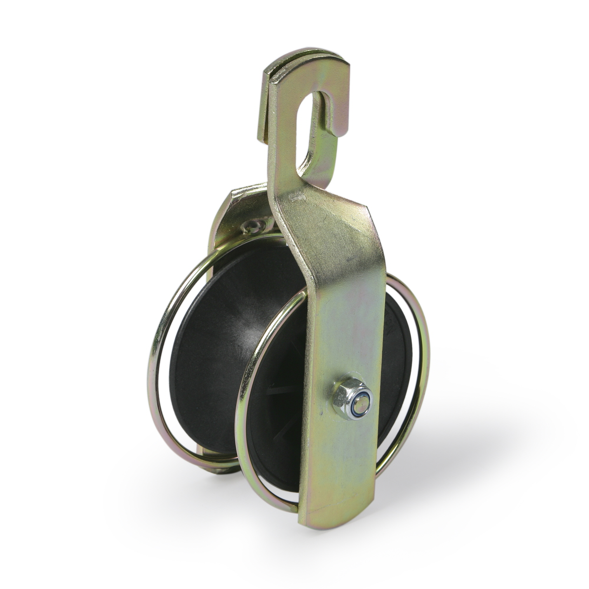 Натяжне колесо ST26.1 для прямих ділянок. Шків виготовлений з нейлону, а рама з оцинкованої сталі. При визначенні розмірів рами колеса враховано кріплення провідника поруч із використовуваним затискачем. Гаки колеса мають такі розміри, що їх можна підвішувати на гаки.