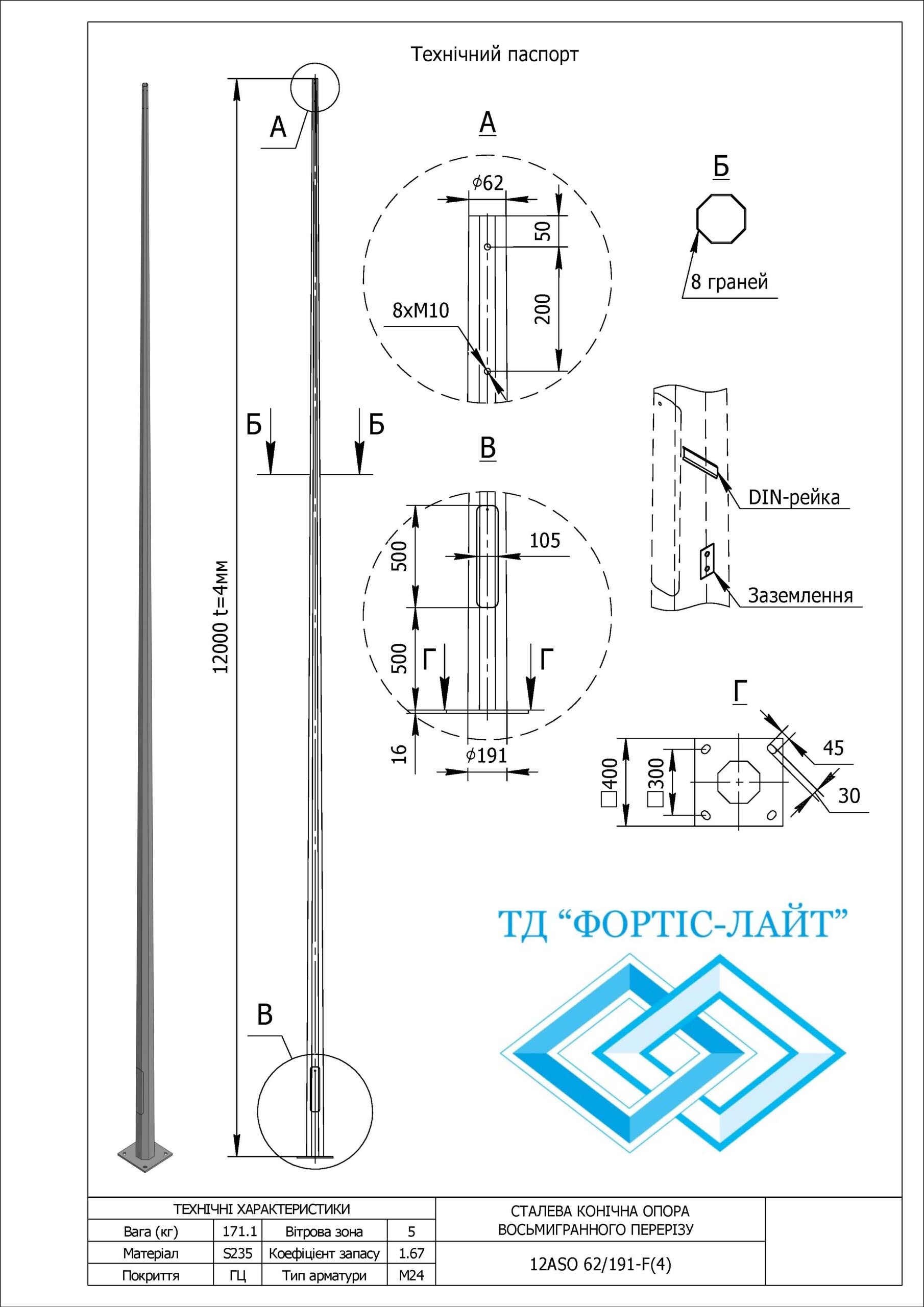 Опора оцинкована восьмигранна 12ASO 62/191-F(4)